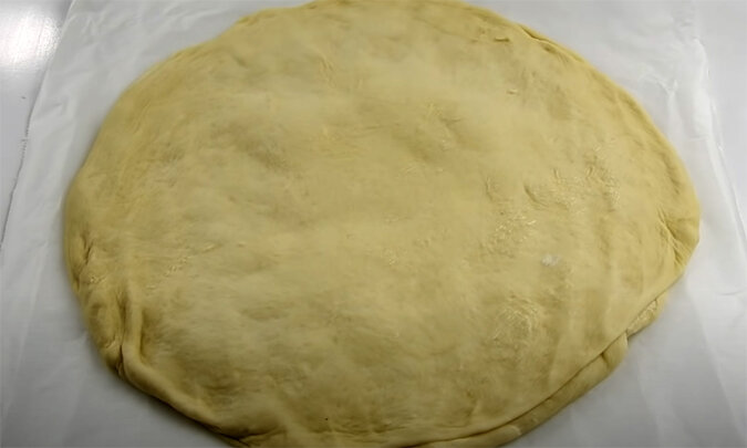 Następnie podziel ciasto na 6 równych części i każdy kawałek rozwałkuj w cienki placek. Teraz robimy podstawę dla placka: przykrywamy stół papierem do pieczenia i kładziemy na nim pierwszą warstwę ciasta. Dobrze smarujemy stopionym masłem, po czym nakładamy drugą warstwę i ponownie równomiernie smarujemy masłem. Zrób to z każdą kolejną warstwą. Gotową bazę odsuwamy na chwilę na bok, na razie zajmijmy się nadzieniem.