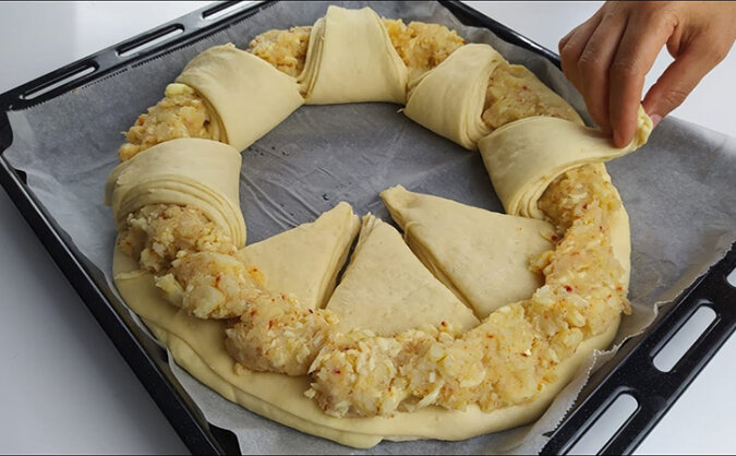 Ugotowane ziemniaki rozgnieść widelcem, posolić, dodać ostrą paprykę i czarny pieprz, a następnie dodać 100 g startego sera. Wszystko dobrze miksujemy. Kolejny krok: formujemy kołacz. Bierzemy blachę do pieczenia i kładziemy na niej bazę ciasta bezpośrednio na papierze. Wykonujemy cztery nacięcia w środku koła, pozostawiając nienaruszone krawędzie, aby utworzyć 8 trójkątów. W podstawy każdego trójkąta nakładamy około dwóch łyżek nadzienia.