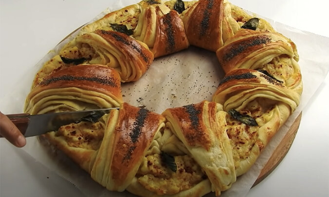 Teraz bierzemy trójkąty za ostre krawędzie i wyginamy je do podstawy, zawijając nadzienie i sklejając brzegi ciasta. Posmaruj ciasto ubitym żółtkiem, dla dekoracji możesz posypać makiem. Kołacz wstawiamy do piekarnika nagrzanego do 180 stopni i pieczemy przez 35 minut.