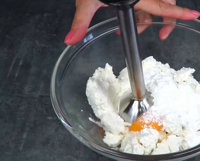 Do dużej miski włożyć twaróg, żółtko, połowę całkowitej ilości cukru i skrobi. Połącz składniki blenderem zanurzeniowym do uzyskania jednorodnej masy.
