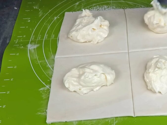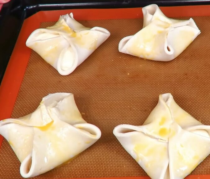Lekko rozwałkuj gotowe ciasto francuskie do kwadratu o średnicy 22-24 cm i pokrój na 4 kawałki. Umieść nadzienie na środku każdego kwadratu.