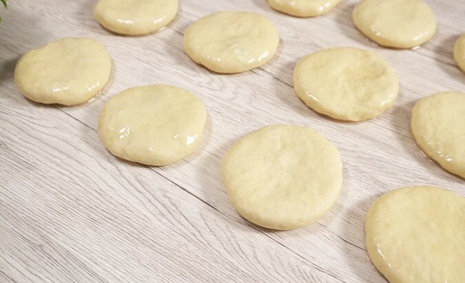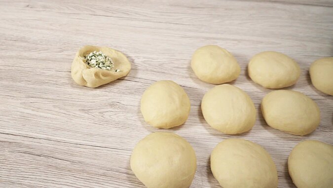 Z kulek robimy małe kółko i wkładamy do środka nadzienie twarogowe lub serowe z ziołami.