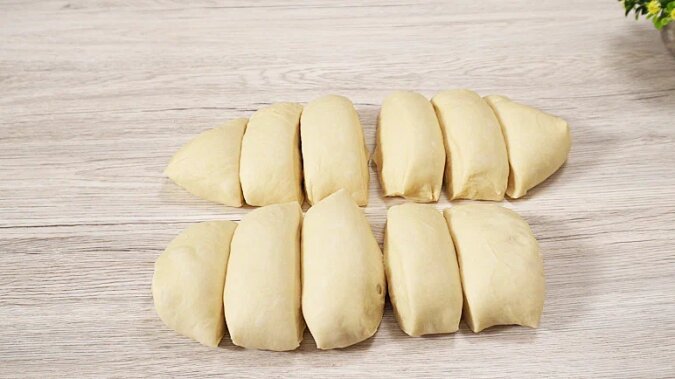 Ciasto dzielimy na 2 części, a następnie każdą połowę na 6 mniejszych części. Robimy kulki. Przykrywamy ręcznikiem i odstawiamy na 15 minut.
