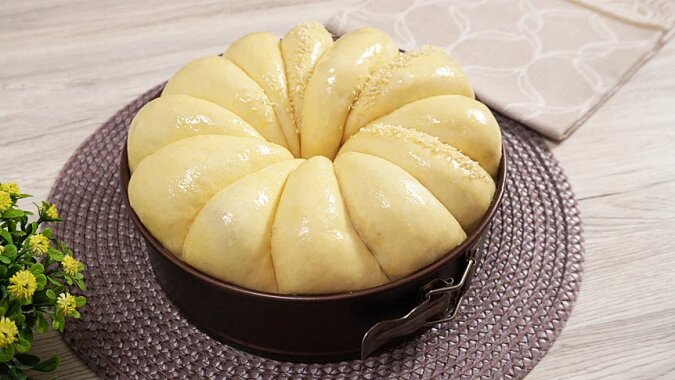 Mieszamy żółtko z mlekiem i smarujemy ciasto, posypujemy sezamem.