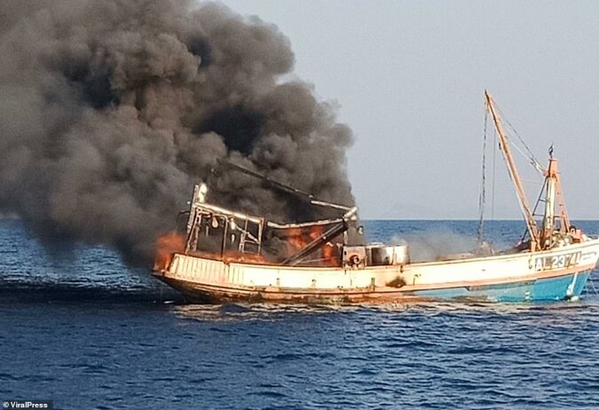 Na rozpadającej się łodzi wybuchł pożar, a załoga porzuciła go, uciekła w pełnym składzie.