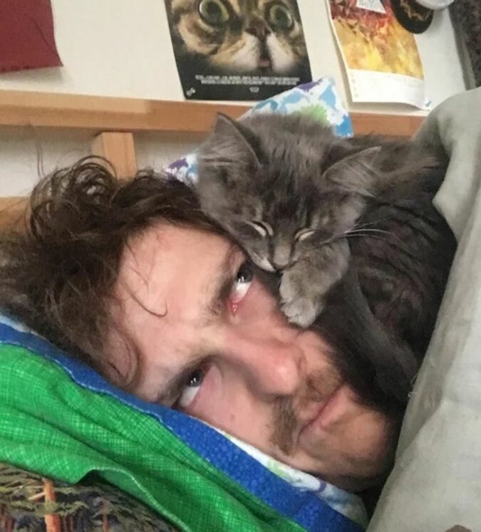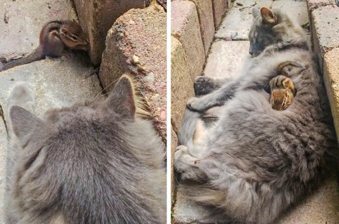 Kot jest nieco zaskoczony, że pręgowiec wybrał go na łóżeczko