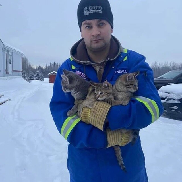 Po upewnieniu się, że kocięta żyją, mężczyzna próbował zabrać je do swojego samochodu, ale nie mógł ich podnieść, ponieważ ich wełna już przymarzła do lodu. Na ratunek przyszła kawa kupiona kilka minut temu. Napój był wciąż gorący, więc bez trudu stopił lód. Kendal zabrał dzieciaki z drogi i przeniósł je do ciepłego samochodu.