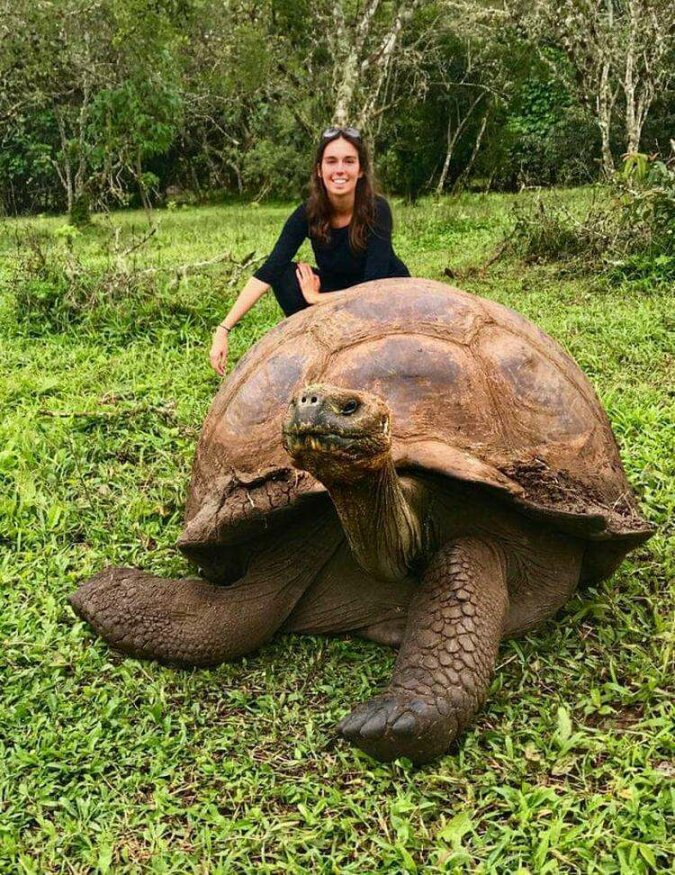 7. Kobieta obok gigantycznego żółwia skórzastego