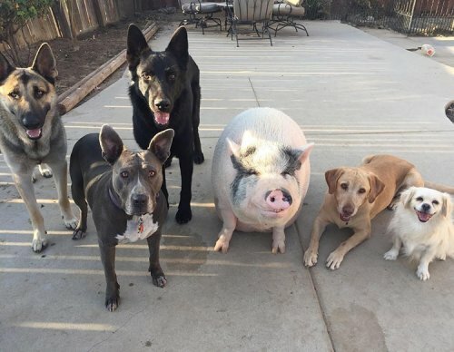 Świnia jest bardzo towarzyska i nie zajęło jej wiele pracy, aby zostać ich bliskim przyjacielem. Zauważ, że wszystkie te psy również mieszkają z tą Amerykanką. Kiedyś były ulicznymi, ale właścicielka uratowała ich od głodu. A psy nie były przeciwne przyjęciu prosiaka do swojej watahy.