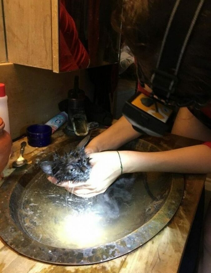 Po nakarmieniu puszysty maluch został umyty, a następnie wyczyszzczony z pcheł. Córka Davy'ego nalegała, aby kot został z nimi. Co więcej, wcześniej zmarł ich stary kot.