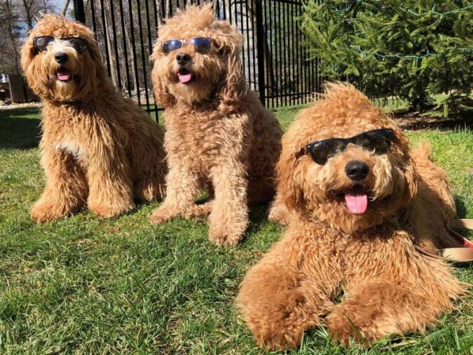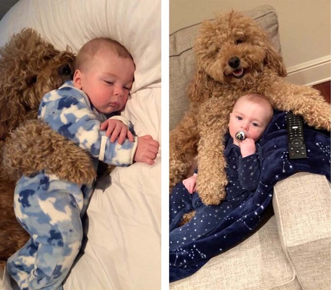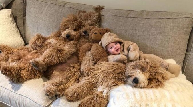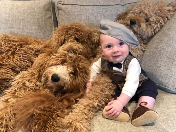 Ten młody człowiek ma szczęście, bo ma najdelikatniejszych i najbardziej puszystych przyjaciół. 6-miesięczne dziecko Theo radośnie pozuje ze zwierzakami rasy goldendoodle - krzyżówki golden retrievera i pudla.