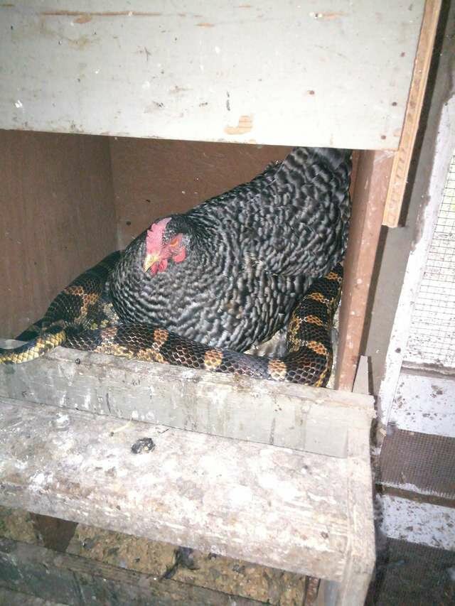 Sarah Alisson z Teksasu przyjechała odpocząć na rodzinnej farmie i jednocześnie pomóc. Kobieta poszła sprawdzić kurnik i ze zdumieniem zobaczyła następujący obraz: do jednej z kur przytulił się ogromny wąż i wygląda na to, że podobało mu się takie towarzystwo. Ale najciekawsze jest to, że kura był absolutnie spokojny.