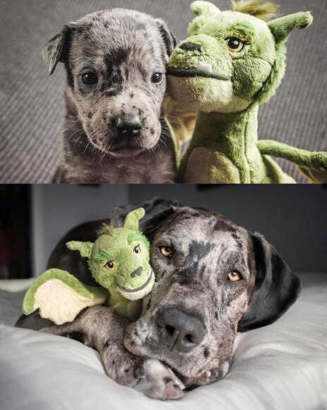 Zawsze dzieje się tak: dostajesz malutkiego uroczego szczeniaka i zanim zdążysz mrugnąć okiem, a przed tobą jest już wielgachny pies. Tak, psy szybko rosną, ale w sercu pozostają tymi samymi małymi dziećmi, o wiernych oczach. W naszym dzisiejszym zestawieniu zdjęć dla Ciebie zebraliśmy zdjęcia, które pokażą, jak zmieniały się na przestrzeni czasu.