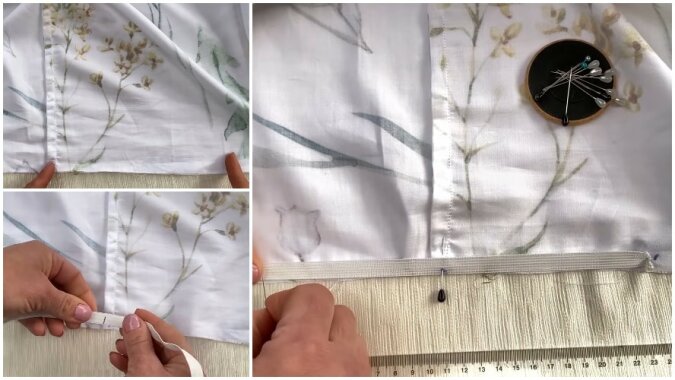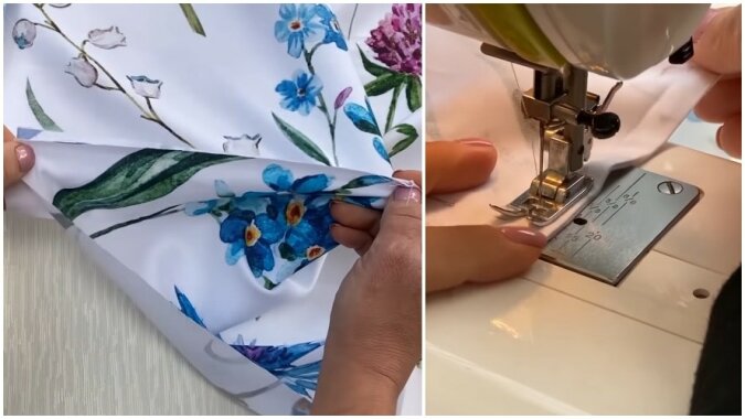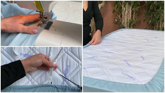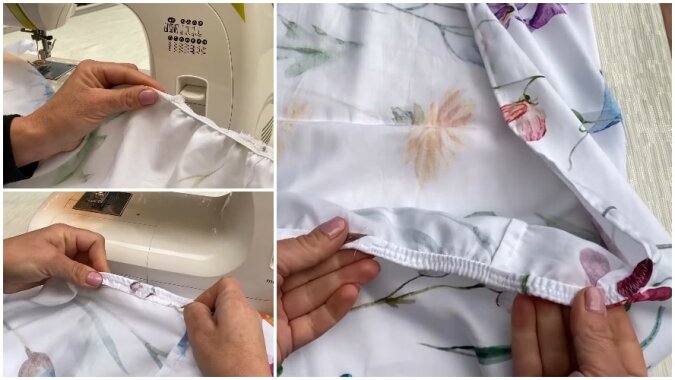 Naciągając gumkę, wykonujemy 2 fałdy po 1 cm w rzędzie. Następnie krawędź prześcieradła szyjemy na całym obwodzie, cały czas wyginając tkaninę, tworząc krawędź. W miejscach, w których występuje gumka, naciągamy tkaninę i przechodzimy ze zwykłego ściegu na zygzak.