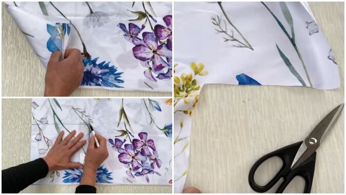 Następnie pozostaje tylko przymocować materiał szpilkami krawieckimi i jednocześnie odciąć wszystkie 4 kwadraty. Teraz na prostokątnym płótnie nie ma narożników.
