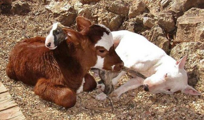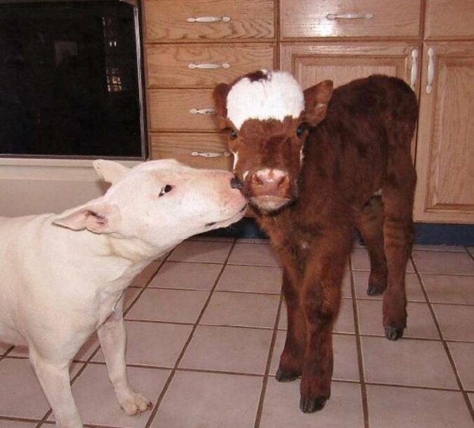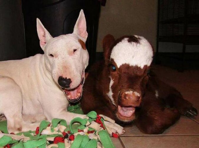 „Moje psy mają duże doświadczenie z różnymi zwierzętami, które ratuję. Cielę to kolejny ich przyjaciel”.