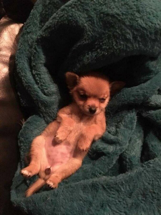 Szczeniak trafił do schroniska później niż kociak. Lil Nugget został przyniesiony do schroniska przez mężczyznę, który znalazł go samotnie leżącego na ulicy. Mężczyzna powiedział, że szczeniak jest w bardzo złym stanie. Dosłownie błagał weterynarza o uratowanie podrzutka.